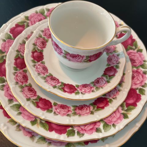 Hyväkuntoinen astiasto jossa soppakulho, teekannu, sokerikko sekä kermakko.