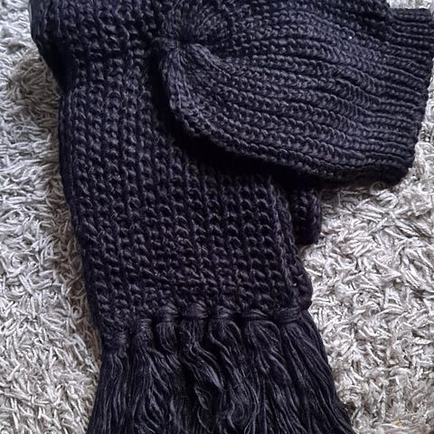 Käsin kudotut myssy ja kaulaliina 100 pros villaa. Kaulaliinan pituus 145 cm + hapsut.
