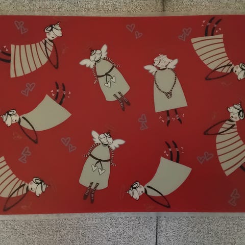 Jouluiset tabletit pöytään. Tablettien halkaisija 28cm