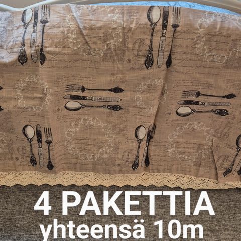 Harmaat, hillitysti kuvioidut,laadukkaasta kankaasta tehdyt verhokapat. Korkeus on 40 cm ja toisen pituus noin 560cm ja toisen pituus 260 cm. Erittäin hyväkuntoiset.