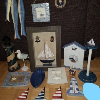 Myydään hyväkuntoiset ja hienot purjevene, majakka, sisustustyyny " Marine Style Welcome on board", simpukat, kivet, alusta, lasipoijut ja verkot 2kpl.