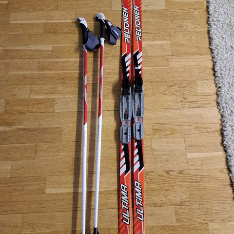 Paljon käytetyt murtomaasukset 130 cm. NNN-side. Ajaneet meillä vielä asiansa kouluhiihdossa.