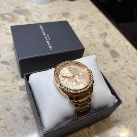 Koruboksissa aikaansa viettänyt todella hyvässä kunnossa oleva Tommy Hilfigerin kello. Joskus käytetty viikon tai kaksi mutta käytön jälkeä ei ole paitsi kellon takana näkyy todella vähän. Ei siis naarmuja lasissa tai vastaavaa. Kultajousesta ostettu n.5 vuotta sitten n.160€ hintaan. Paristo loppunut niin se täytyypi käydä vaihtamassa.