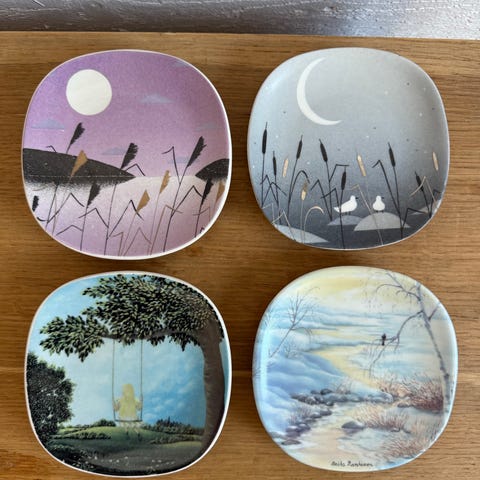 Myydään 4kpl Arabian käsinmaalattuja seinälautasia. Alkuperäisessä pakkauksessa, joten käyttämättömiä. Voin myydä myös yksittäin, silloin hinta 15/kpl€.