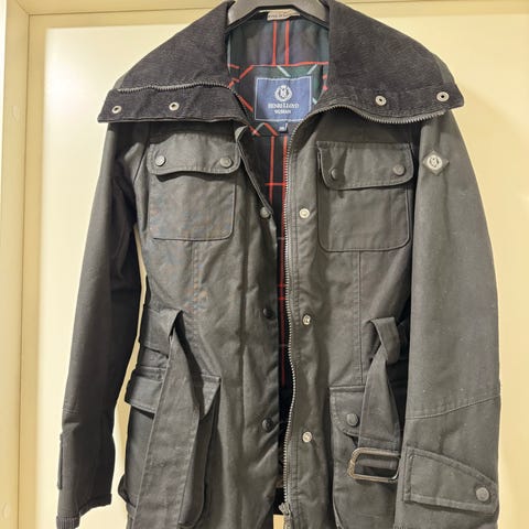 Lähes uudenveroinen paristi käytetty vahakangastakki. Made in England. Laadukas verrä pitävä takki. Isoja taskuja, irroitettava huppu. Punainen (kuva haalistaa väriä hivenen).