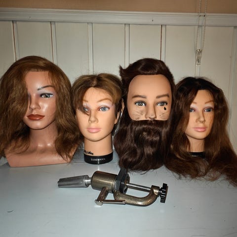 Parturi-kampaajan harjoituspäät ja niihin kuuluvat kiinnityslaitteet 2 kpl. Mies ja nainen. Kunto hyvä. Hinta 25e kpl. molemmat yht. 40e