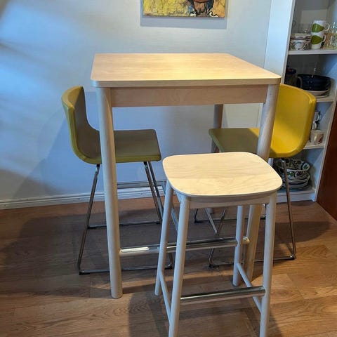 Myydään muuton vuoksi RÖNNINGE baaripöytä ja kaksi baarijakkaraa. Hyvä käytetty kunto. Toisessa tuolissa muutama naarmu istuinosassa (kuva). Metallit tummuneet.