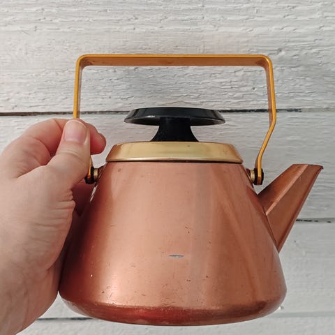 Kuvien mukainen elämää nähnyt vanha Opa OY Peltiteos AB, kuparinen kahvipannu. Vetoisuus 1L, korkeus 20cm kahvan kanssa, halk.noin 39cm.