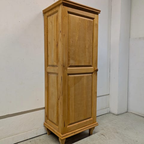 Ethän tingi. 120cm leveä ja 210cm korkea, oven kanssa 61cm syvä kaappi. Tukeva ja hieno vaatekaappi, jossa puuovet mäntyovet. Toisella puolen siivouskaappi, toisella hylly ja tanko. Tukeva kuin mikä. Tehdaskoottu, tätä ei osissa viedä pois. Ainoa vika on vasemman puolen ylähyllyn takalevyyn tullut murtuma tai palkeenkieli, joka ei vaikuta käyttöön millään lailla, on vain esteettinen vika eikä sitäkään huomaa ja muista, kun hylly on täynnä tavaraa. Ainakin me huomasimme sen juuri kun hyllyä tyhjennettiin. Toki tiedämme milloin ja missä kolhu on tullut. Kaapit olleet uudesta eli vuodesta 1980 meidän perheen omistuksessa. Omat kantajat mukaan, meillä ei ole mahdollista auttaa kantamisessa.