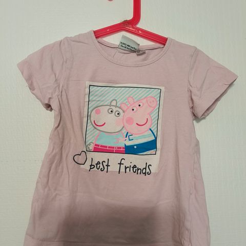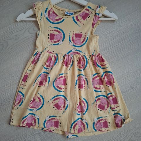 Pipsa Possu collegemekko 110/116cm ja t-paita 104/110cm, molemmat sopivia 110cm koossa. T-paidassa tummentumaa ja haaleaa tahraa, jota en ole kokeillut poistaa.