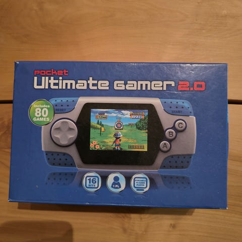 Kuvanmukainen, uusi, vielä tehtaan muoveissa oleva käsikonsolipelilaite.