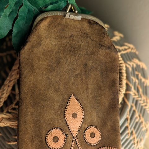 Vintage pyöreä, rannekkeellinen nahkapussukka,
