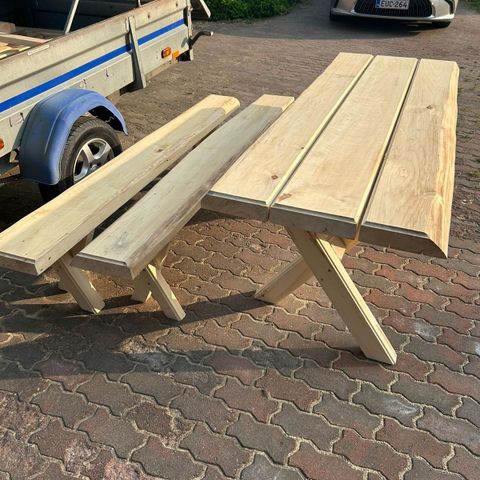 Käytetyt, jostain 1980 luvulta tietääkseni. Talvisin sisällä. Vastii pesun/ maalauksen halutessa. Myydään ryhmänä. Erikseen 100e/ kpl. Pelkkää pöytää en myy. Mmm