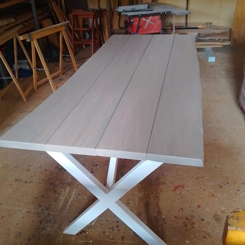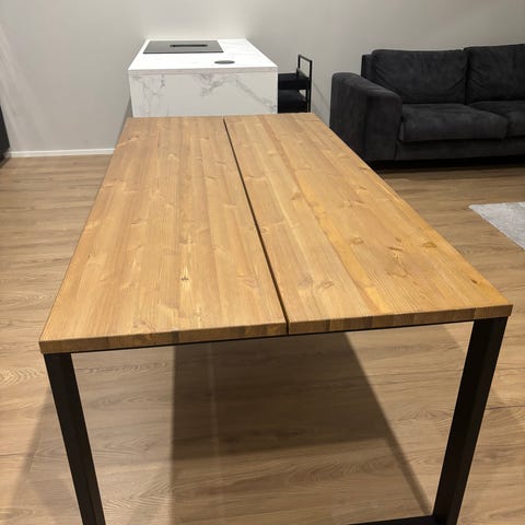 Tyylikäs lankkupöytä! Kansi on tehty kahdesta lankusta, joissa on harjattu pinta.