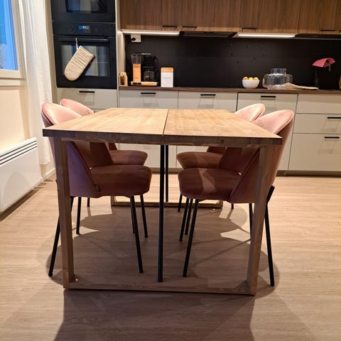 Trendikäs ruokapöytä jossa tukevat mustat metallijalat.