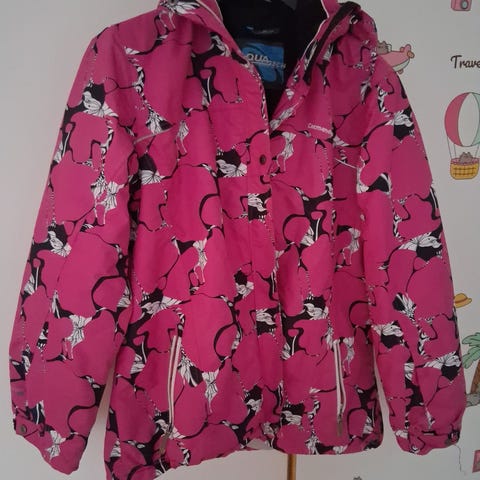 Turkoosi talvitakki koko 40, mutta mielestäni niukka koko. Pieni reikä hupun sisäosan kankaassa.
