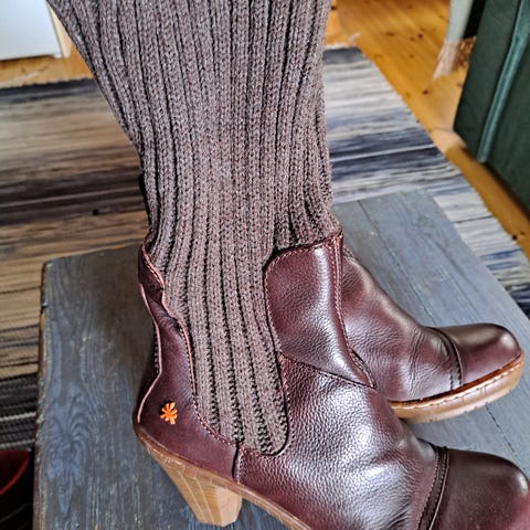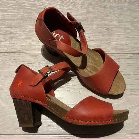 Tilavalestiset, nahkaiset kiilakorko kengät. Ruskeat. Koko 38. Takana säädettävä solkiremmi. Nilkan ympäri tarraremmi. Todella vähän käytetty.