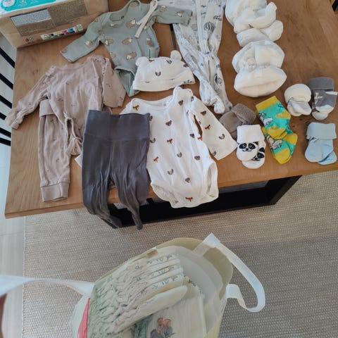 Hyväkuntoinen vastasyntyneen vaatepaketti.