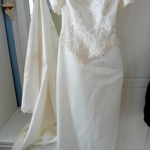 Myydään kerran käytetty Kouvolan Ajan ompeleesta ostettu hääpuku. Sydämen mallinen pääntie. Korsetti osuuteen lisätty ompelijan toimesta tukirankoja. Sekä mahdollisuus piilottaa insuliinipumppu hameen sisään. (Ei näy tai vaikuta käyttöön ilman tarvetta tälle pminaisuudelle :) ) edellinen käyttäjä 170 cm pitkä koolta L -XL/44-46. Puku käytetty pesulassa. Mukaan koristevyö ja pitkä huntu.