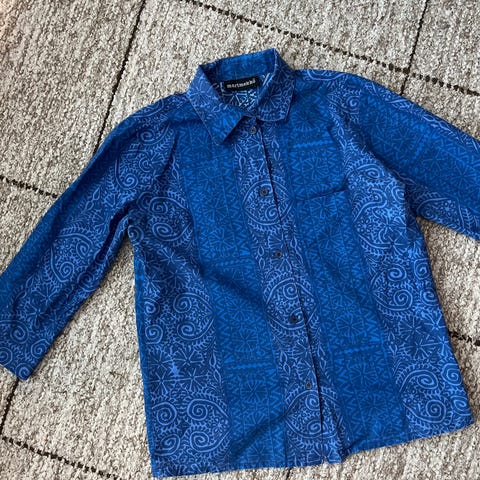 Käyttämättä jäänyt Marimekon upea sinikuvioinen sammettiveluuripusero muistaakseni 1990-luvulta. Tummansinisellä pohjalla kirkkaamman sinisiä kuvioita. Värit syvät ja kauniit.