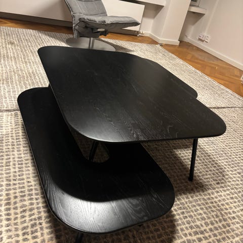 SITS tetris-sohvapöytä setti. Sisältää 3 eri kokoista sohvapöytää. Myydään vain settinä. Kansi mustalakattu puu, jalat valkoinen metalli.