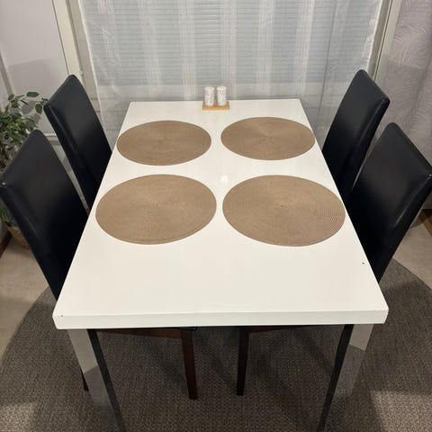 Pöydän ja tuolien kunto on hyvä, mutta kuvassa näkyy muutama jälki. Pöydän pinnassa on myös oletettavasti joitain kosteusvaurioita, jotka tuntuvat pinnassa, mutta ei näy päällepäin. Tuolien istuinpinta on mustaa kangasta. Myös tuoleissa on aika huomaamattomia pieniä raapimiskohtia ja pari jälkeä. Ei ainakaan itselle ota silmään. myyn vaan yhdessä