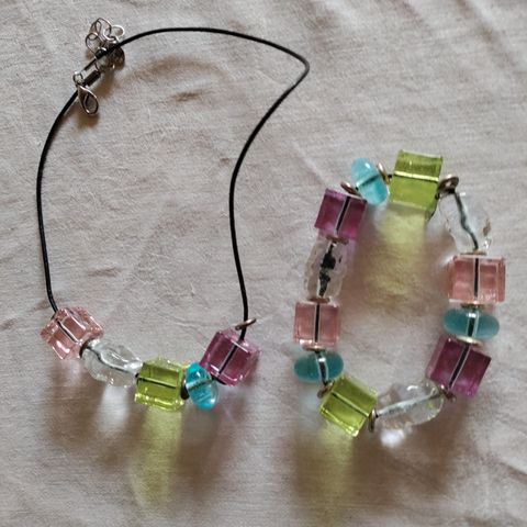 Venetsiasta ostettu kaulakoru, ympärys 40cm ja korvakorut. Sydämet Muranon lasia, Antica Murrina Veneziana. Sydämen korkeus riipuksessa 2 cm, korvakoruissa n. 1 cm. Rannekoru ostettu muualta, saa kaupan päälle.