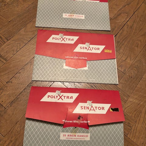 Kuvan vanhat, mutta täysin käyttökelpoiset hiilipaperit. Niitä on yli 50 kpl. Hankala laskea, mutta montaa ei ole käytetty sen jälkeen kun niitä oli 90 kpl. Voin lähettää tai nouto Jämsän Alhojärveltä.