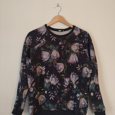 Uhanan lyhyt kukallinen college. Vähän käytetty, ei käytön jälkiä. Kai-kai 48cm, olka-helma 48cm. Reilua kokoa. Menee S-kokoiselle.