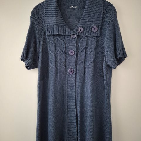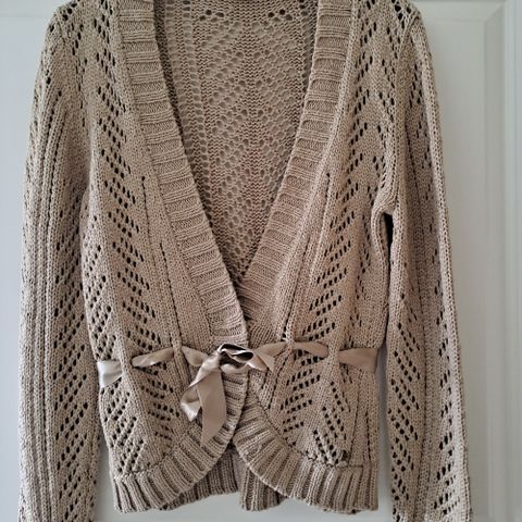Noomin harmaa, pinkkipilkullinen neuletakki. Koko S-M. Hartialeveys 34 cm, pituus 57 cm. Jäänyt lähes käyttämättömäksi (pesty kerran).