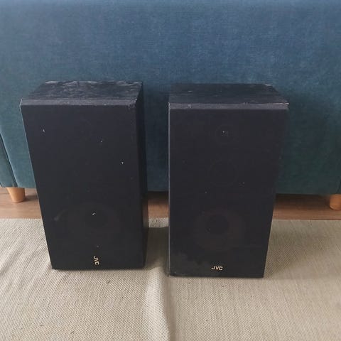 Valkoiset JVC speaker system merkkiset kaiuttimet. Näitä kaiuttimia on yhteensä kaksi. Kaunis helmiäishohtoinen valkoinen on kaiuttimien värinä. Kaiuttimien edessä olevat kankaat ovat väriltään harmaa. Oikein siistit ja ehjät kaiuttimet. Hyväkuntoiset kajarit jollekin muulle käyttöön. JVC speaker system merkkiset kajarit. Viimeksi nämä on ollut tietokoneessa kiinni. Nyt ei ole enää käyttöä ja nämä joutaa jotain muuta viihdyttämään. On ihan täysin toimineet, kun on ollut viimeksi käytössä.