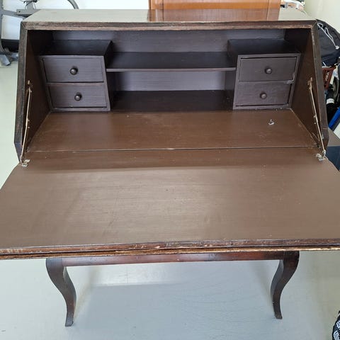 Katalyytti- ja automaalilla (eli mattapinta ja kiiltävä pinta) ruiskumaalattu klaffilipasto. Hyvässä kunnossa mutta elämän jälkiä näkyy. Toisessa alakaapissa ei ole hyllyä. Lukko toimii. Punainen väri ei ole ihan noin kirkas mitä kuvat antaa ymmärtää. Ylähylly syvyys 21 cm, alaosan syvyys 46 cm ja syvyys kun klaffi on auki 89 cm.