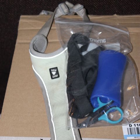 Käytettyjä pienen koiran ( tiibetinspanieli) tarvikkeita,