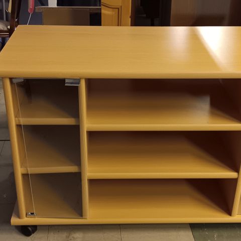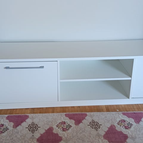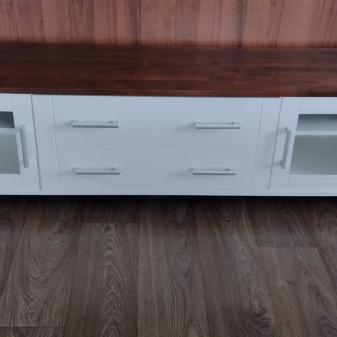 Kaunis tammen ja valkoisen värinen Jasmin tv-taso. Tv-tasossa on tammen värinen 16 mm laminoitu kalustelevyrunko, valkoiset etusarjat, ABS-reunanauha, alumiinivetimet sekä tammijalat. Tv-tasosta löytyy kaksi kippiovellista kaappia sekä avohyllyt. Tv-tason leveys on 160 cm, syvyys 40 cm ja korkeus 50 cm.