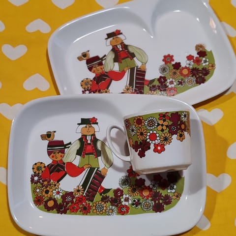 Astioita, lähinnä lautasia. Norjalainen Figgjo, laadukkaita ja kestäviä. Espresso-kuppien lautasia 8 kpl (halk.reilu 12 cm) ja yksi kuppi. Kahvikupin aluslautasia yhteensä 10 kpl (halkaisija 14,5 cm) ja yksi kahvikuppi. Muuten kaikki valko-sini-vihreitä, mutta 3 isompaa lautasia valko-lohenpunanen tms.-sinisiä.