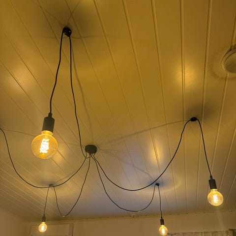 Muuton harmaa Myy, tai Mhy, kattovalaisin. Korkeus noin 23 cm, halkaisija noin 20 cm.