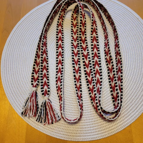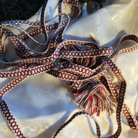 Uutta käsinvalmistettua pirtanauhaa, väri mustavalkoinen, villaa