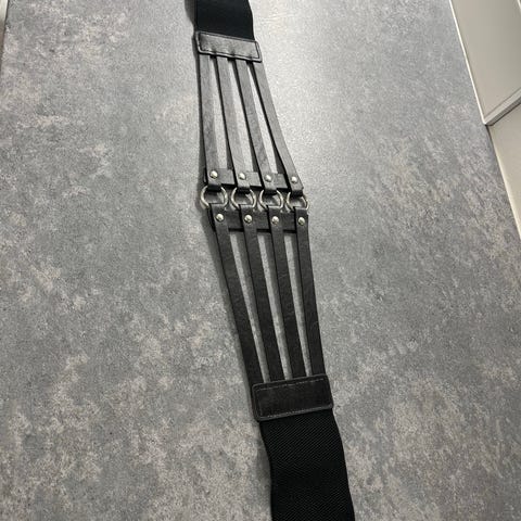 Vyötärölle tai lanteille sidottava käyttämätön, uuden veroinen, metalli nahkavyö. Vyö sidotaan kiinni nahkaosasta solmulla. Nahkahapsut jäävät roikkumaan koristeena lanteelle. Hapsut ovat nahkaa tai todella hyvälaatuista tekonahkaa, vaikea sanoa.