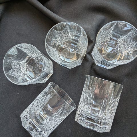 Lasit ovat kirkasta lasia, monikulmainen muoto, jäärakennetta muistuttava tekstuuri.