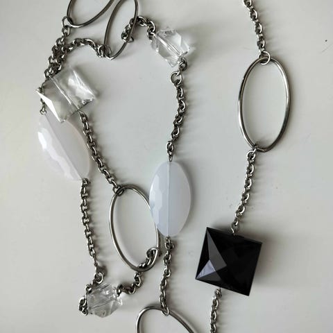 Pitkä kaulakoru jotain muovin tyylistä materiaalia.