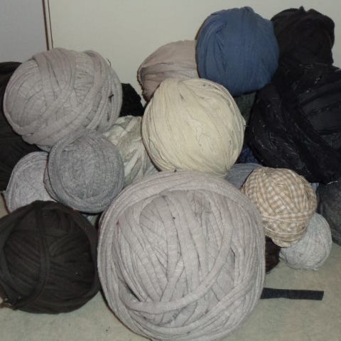 Myyn kudontasuunnitelmien muuttuessa, farkkumatto ajatuksena siis, kuvien ison muovikassillisen farkkukudetta.