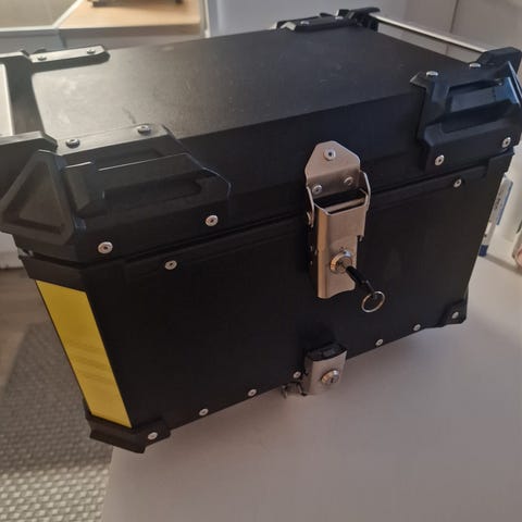 Kuvien mukainen ylälaukku. Lukko sillai rikki että toimii millä vaan avaimella. Muuten siisti ja ehjä. Pohjalevy ja joku kiinnike teline mukana.