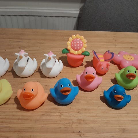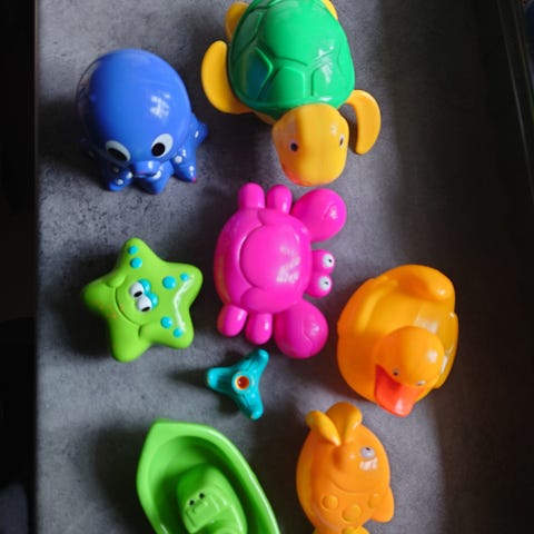 Myydään hyväkuntoinen kylpylelu, jossa vipua kääntämällä nalle ui.