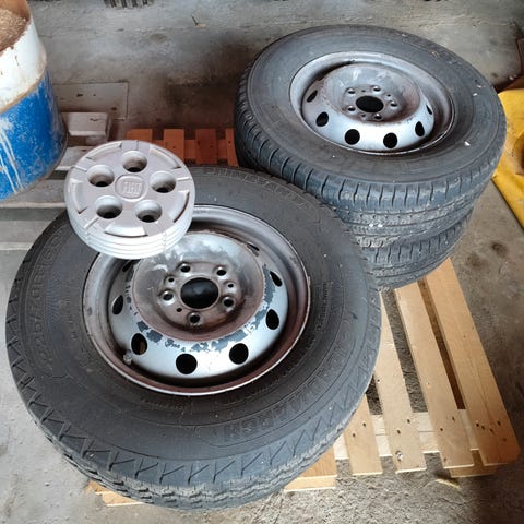 Myydään matkailuautojen renkaat+vanteet Fiat Dukato. 225/75r16C pinta noin 3-4mm