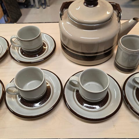 6 kahvikuppia ja asetittia. Arabia Pirtti sarja, suunnittelija Raija Uosukainen.