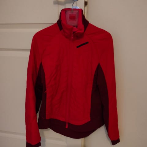 Craftin ohut juoksutakki, koko L. Edestä ja hihoissa kyynärpäihin asti tuulisuojattu. Muu kangas (musta) joustavaa trikookangasta. Kai-kai 56 cm.