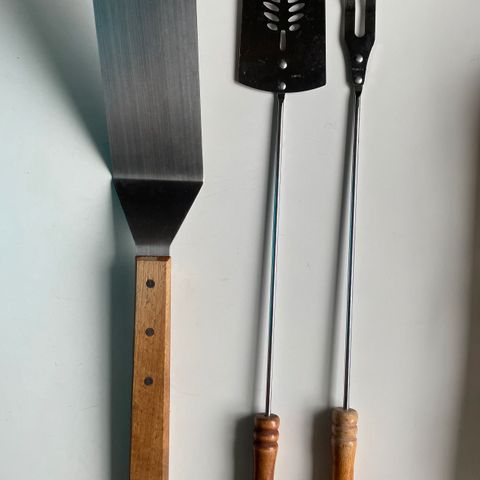 Kuvanmukainen laadukas uusi grillausvälinesetti. Puuvartiset ottimet nahkalenkeillä. Mukana musta essu.