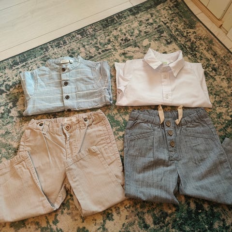 Mukana kaksi kauluspaitaa ja yhdet juhlavat housut. Vaaleanruskea ruutupaita punaisin tehostein Esprit, koko 86, 18 months. Joulunpunainen kauluspaita h&m, koko 80. Beiget housut Name it, koko 86. Kuminauhakiristysmahdollisuus vyötäröllä. Lahkeet mielestäni lyhyehköt ja housut leveää mallia. Eivät juuri jousta.