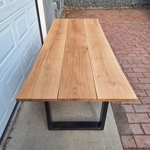 Oikeaa puuta. Käsityönä tehty. Tammipuuta. Helppo hoitoinen. Tuolit eivät kuulu kokonaisuuteen. Metalliset tyylikkäät mustat jalat (kevyet). Ei raskas pöytä kantaa. Muuton myötä seuraavalle.