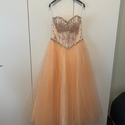 Paksua helmiäisen/haalean roosan väristä satiinia oleva hää/iltapuku/vanhojentanssimekko. Nyörityksen ja todella napakan yläosan ansiosta puku istuu hyvin. Ollut kerran käytössä, jonka jälkeen pesulassa pesetetty, joten on kuin uusi! Lyhennetty 163cm pituiselle sopivaksi. Sijaitsee Mynämäellä, mutta sovitus/lähetys sovittavissa.